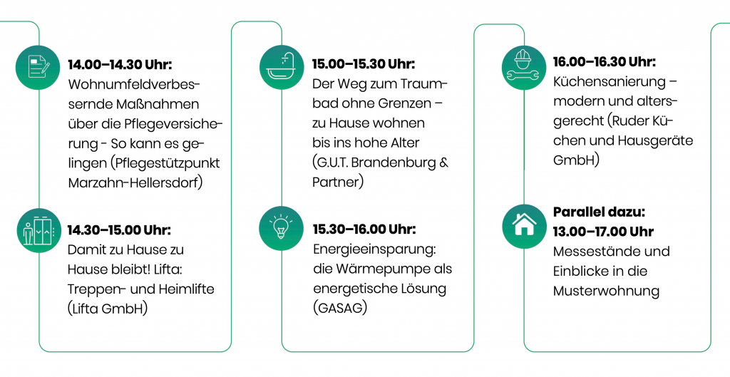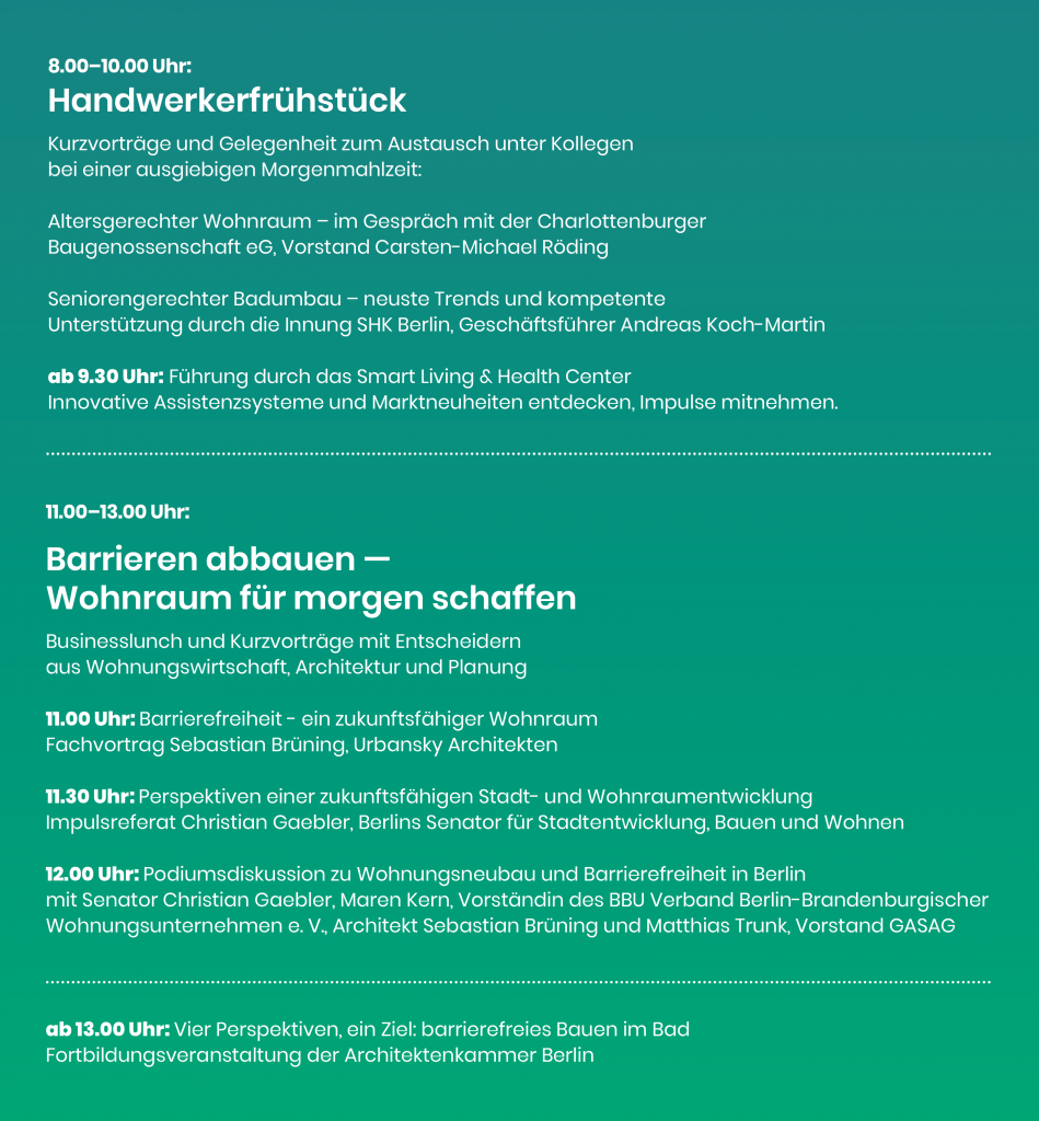 UM- UND AUSBAUTAG Barrierefreie Wohnkonzepte für jedes Alter und jedes Zuhause Messestände rund um lebenslanges selbstbestimmtes Wohnen, Führungen durch die Musterwohnung, Infos zu Umbautrends und Energiesparmöglichkeiten Haus der Zukunft am Unfallkrankenhaus Berlin Blumberger Damm 2k 12683 Berlin-Biesdorf Es laden ein: Öffentliches Programm Programm fürs Fachpublikum Standplan Anfahrt